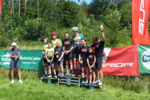 Starty mladších žáků a žákyň už diváci viděli na bez mála tříkilometrovém okruhu, se zakomponovanými náročnými technickými pasážemi, včetně legendárního „Šafářova dvorečku“. Počasí bylo stále optimální, divácká kulisa parádní, počty startujících rekordní… Rovná dvacítka chlapců – mladších žáků – změřila na náročné trati svoje síly a opět to byla pastva pro oči… O zlato si to rozdali hned tři borci: Jakub Křupala (TUFO Cyklozákladna Otrokovice), Adam Pražan (SPORTEG) a Filip Jirout (DK Bike Shop Racing Team), které v cíli nakonec rozdělilo pouhých 11 vteřinek… A byl to Kuba Křupala, který po Sáře Škubalové připojil do „tufácké“ pokladnice další zlato! V kategorii mladších žákyň byla situace na trati poněkud fádnější… Domácí favoritka, Justýna Novotná (MORAVEC Team) nenechala nikoho na pochybách, že si zlato nenechá ujít a zvítězila s téměř minutovým náskokem! I ona svým vyzrálý projevem na trati naznačila, kde by bikoví experti měli hledat favoritku v této kategorii před blížícím se vrcholem sezóny v Harrachově… Díky nejrychlejšímu staršímu žákovi Lukáši Herlanderovi se v Boskovicích – Doubravách ve zlaté barvě zviditelnil i další TOP team z Moravy – Cyklo Team Kolárna Olomouc. Lukáš vyhrál tuto prestižní kategorii stejně jistě, jako tu svoji starší žákyně, Amálie Gottwaldová (CP Team Boskovice). Druhý blok startů uzavíral opět, podobně jako v Bukové, závod tříčlenných štafet. A podobně, jako před 14-ti dny, to byl mazec! Souboj svedlo 20(!) teamů, což jasně naznačuje, že poháry zakladatele MTB „Vrchoviny“ Ing. Aloise Hložka, pro tři nejlepší štafetové týmy, jsou „sakra“ velkou motivací! A který tým byl nejrychlejší v Boskovicích? Kombinovaná sestava s názvem „EMO“: Eliška Hanáková, Marek Letev a Ondra Průcha. Pořadí tří nejlepších štafet z Boskovic, kompletní pořadí i průběžný štafetový lídr po dvou bodovaných závodech, to obojí je uvedeno v závěru této aktuality.
