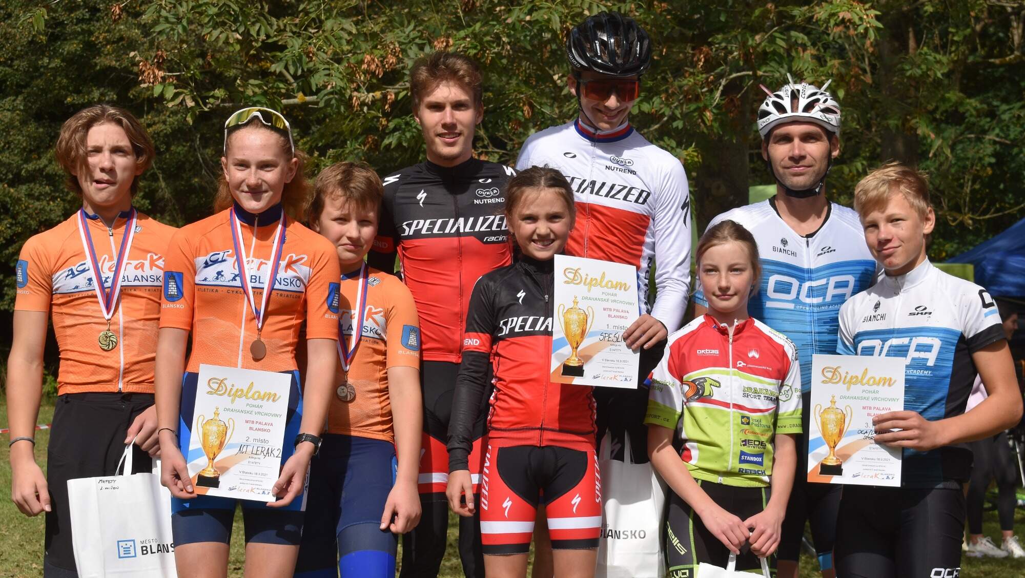 Až do startů starších žáků a žákyň zůstával hostující tým, jehož členové Velkou cenu Blanska tak vzorně zorganizovali, stále bez zlaté medaile. Po dojezdu těchto kategorií však bylo už vše jinak. Trumfy „Leraků“ – Josef Kuchař a Nikola Bradáčová zvládli s jistotou úlohu favoritů a obohatili týmovou medailovou sbírku o dvě zlaté „placky“! Oba byli – k velké radosti domácích fanoušků – hodně suverénní! Zlato jsme přáli určitě hlavně Nikolce, které  kov nejcennější na letošní „Vrchovině“ dvakrát (Kořenec, Knínice) těsně unikl! A co víc: tato nadaná multisportovkyně přijela na palavské cross-country ze závodu v duatlonu, na kterém vybojovala také medaili – stříbrnou! Obdivuhodný dvojboj v jednom dni… Obdivuhodný výkon! Zbývá doplnit, že celkovými vítězi v těchto prestižních kategoriích jsou pro letošek Matěj Grošek (Open Cycling Academy – v Blansku 3. místo) a možná trochu překvapivě, ale určitě zaslouženě – Jolana Husáková (ACT Lerak – v Blansku 6. místo).