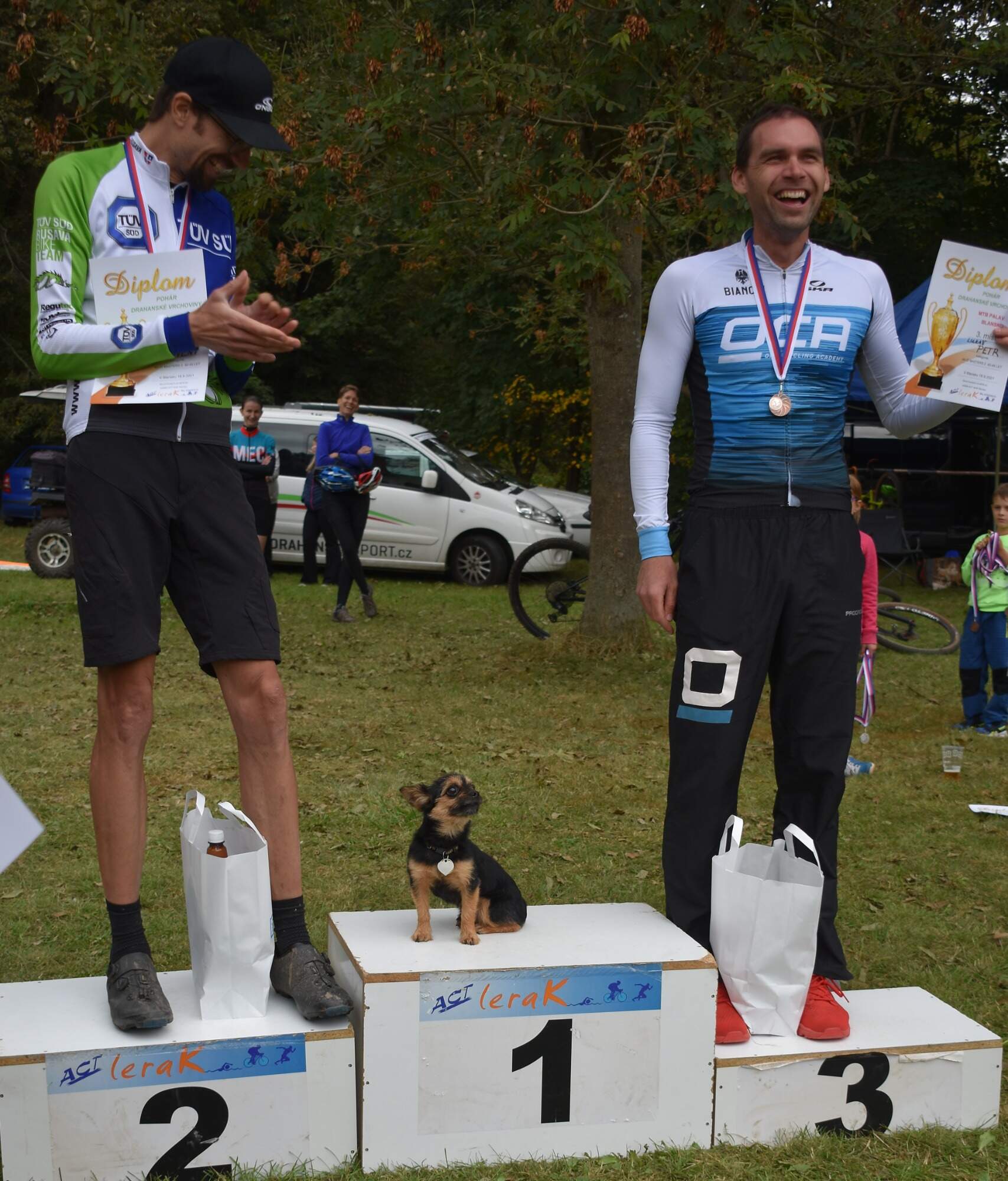Pak už naposled zazněla slavností fanfára pro vítěze a starosta Města Blanska, Jirka Crha rozdal zbylé sady medailí a věcné odměny těm nejlepším z odpoledního startovního bloku. Až do posledních minut ale Velká cena Blanska bavila: viděli jsme nevídané „převtělení“ vítěze závodu Masters II.Pavla Holce (Nativesport) v roztomilého psíčka jménem Fido… Pravdou bylo to, že se Pavel v době, kdy byl volán na první „bednu“ nacházel z dosahu repro aparatury, u svého vozu. A tak za něj velice zdatně, byť nechtěně, zaskočil psík Lukáše Petra, zmíněný Fido,  který bystře využil volné „první bedny“, aby mohl být svému pánu co nejvíc nablízku!  A tato úsměvná epizoda byla asi tou nejlepší tečkou za povedenou blanenskou „race“.