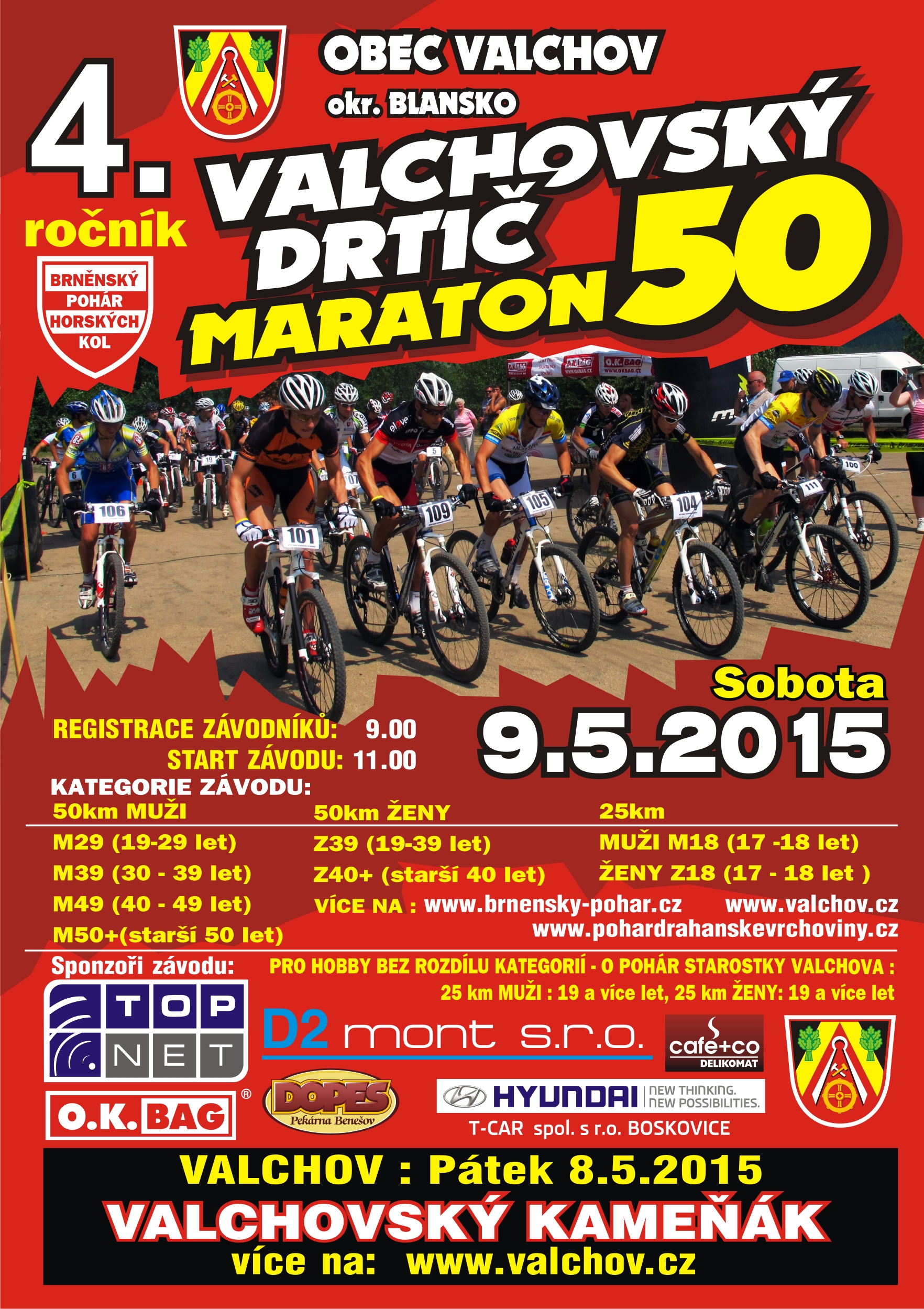 Maraton na 25 nebo 50 km Valchovský drtič je v sobotu 9. 5. 2015 učen starším 15 let. I ten se boduje do seriálu PDV a navíc Brněnského poháru horských kol – http://www.brnensky-pohar.cz/.