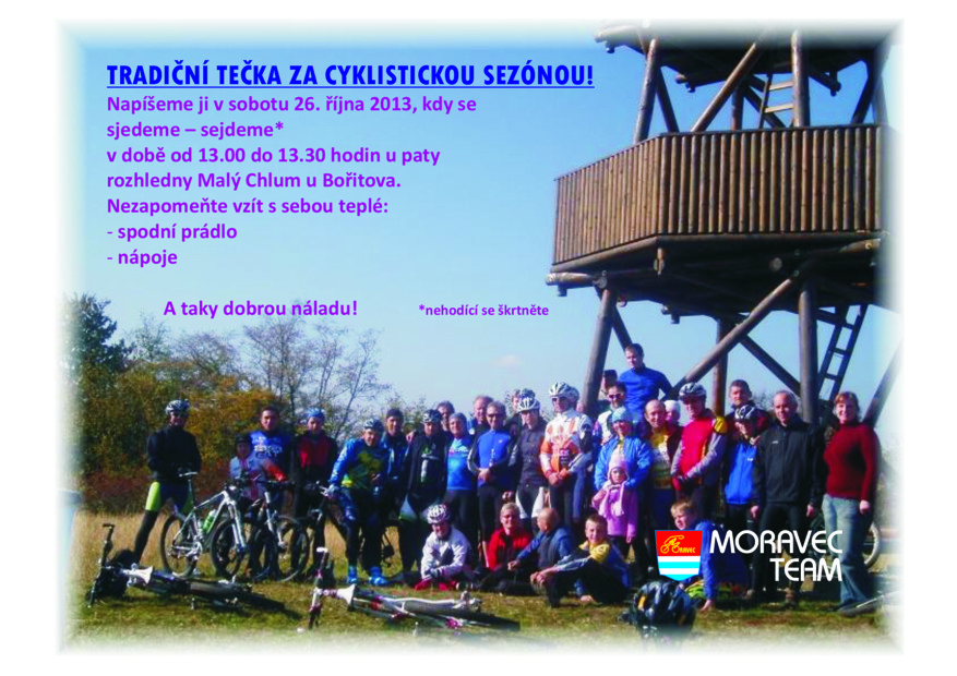 Zveme Vás na TRADIČNÍ TEČKU ZA CYKLISTICKOU SEZÓNOU! Napíšeme ji v sobotu 26. října 2013, kdy se sjedeme – sejdeme* v době od 13.00 do 13.30 hodin u paty rozhledny Malý Chlum u Bořitova.
