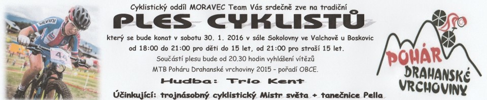 Už po čtvrté oslaví cyklisté z regionu na svém plese supr výsledky za uplynulý rok. Po třech vydařených tanečních večerech v sále letité Sokolvny na Benešově, pohostí tentokrát tancechtivé (nejen) cyklisty premiérově Sokolovna ve Valchově. Vše vypukne v sobotu 30. ledna 2016 a začneme